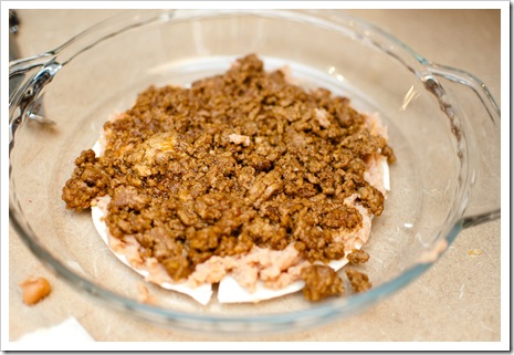Brown your meat & drain. Return to saucepan & add taco seasoning, 3/4 cup water, & stir and simmer until most of the water evaporates. Meanwhile, cut your tortillas into 4ths and place 4 slices in a pie dish. Now, you don’t have to cut your tortillas into 4ths, but this makes serving SOOOOO much easier.